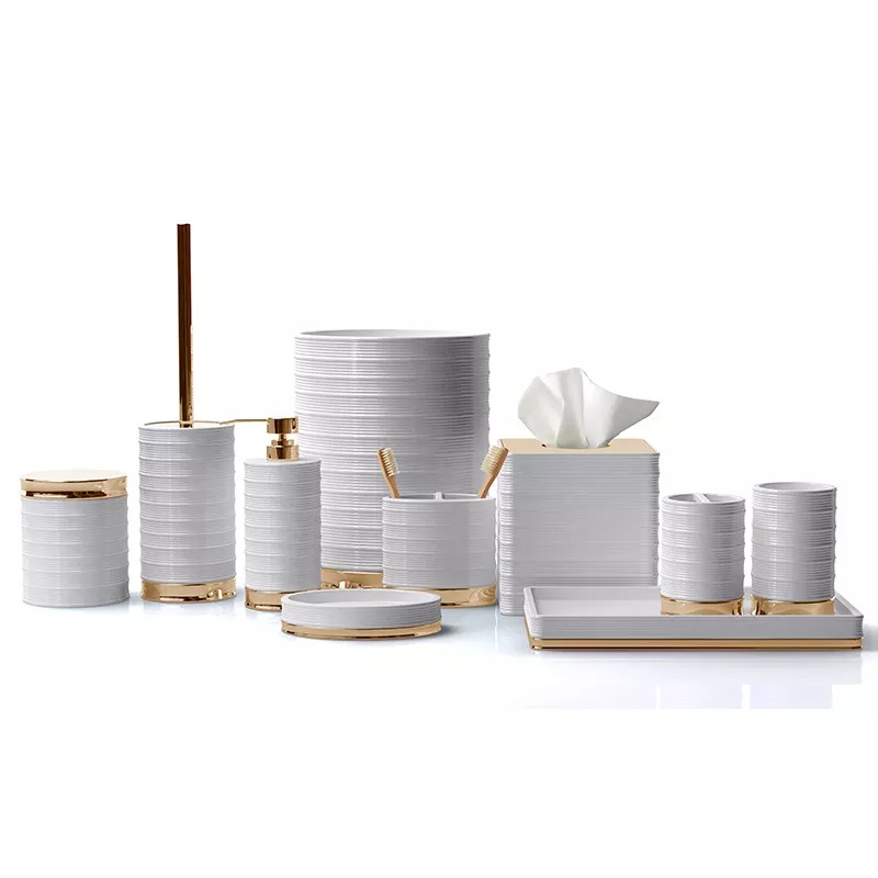 إكسسوارات الحمام فاخرة مجموعة أدوات صحية بيضاء حديثة، مجموعة حمام راتنج بوليريسين مع قاعدة ذهبية يشمل: موزع غسول من الراتينج ، كأس من الراتينج ، حامل فرشاة أسنان من الراتينج ، طبق صابون من الراتينج ، صندوق نفايات الراتنج ، صندوق مناديل راتينج |